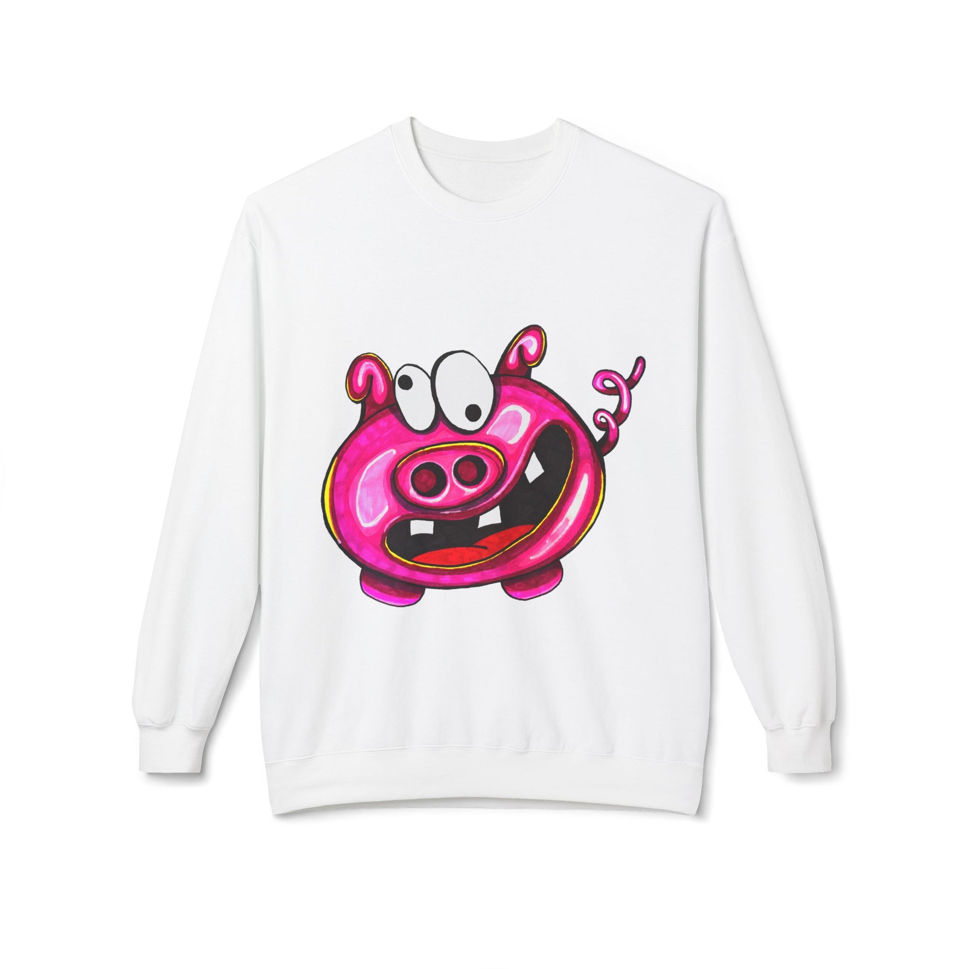 Add a playful touch to your wardrobe with this engaging Unisex Midweight Softstyle Fleece Crewneck Sweatshirt. Featuring a whimsical, cartoonish pig design, this sweatshirt evokes a sense of fun and joy, making it perfect for casual outings or cozy nights in. It offers a relaxed fit, thanks to its dropped shoulders, providing both comfort and style. Ideal for anyone who loves cheerful and quirky clothing, it makes a fantastic gift for friends and family during holidays like Christmas, birthdays, or even just to celebrate a loved one. Wear it at casual gatherings, family events, or during festive seasons to spread smiles and warmth.